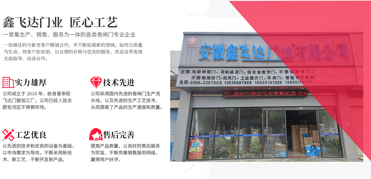 - 安徽鑫飛達(dá)門業(yè)有限公司成立于1998年,前身是阜陽飛達(dá)門窗加工廠,現(xiàn)在公司已經(jīng)入駐合肥包河區(qū)不銹鋼市場。本公司是一家集生產(chǎn)、銷售、服務(wù)為一體的各類卷閘門專業(yè)企業(yè)。公司采用國內(nèi)先進(jìn)的卷閘門生產(chǎn)流水線,以及先進(jìn)的生產(chǎn)工藝技術(shù)、從而提高了產(chǎn)品的生產(chǎn)速度和質(zhì)量。旗下?lián)碛酗w達(dá)九州和飛達(dá)門業(yè)兩個(gè)注冊商標(biāo)。 產(chǎn)品種類齊全 ,質(zhì)量可靠,主要有不銹鋼推拉門,防火卷簾門,電動(dòng)卷...